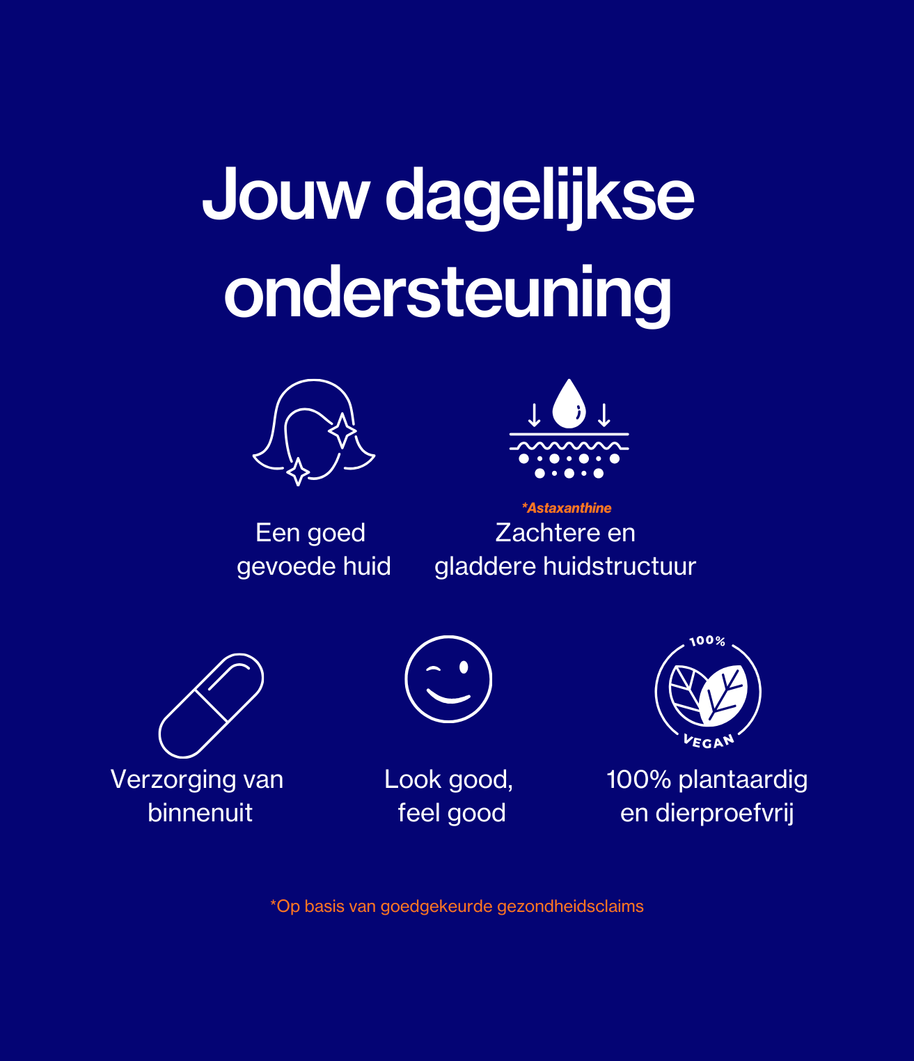 Een vegan beauty supplement met onder anderen Astaxanthine en Zink, die de huid van binnenuit verzorgen.*