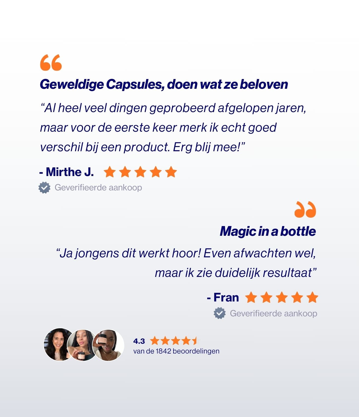 Doorgaans raden we aan om het dagelijks te blijven gebruiken, net zoals je bij de meeste huidverzorgingsproducten doet. Je zou na 1, 2 of 3 maanden dagelijks gebruik ook over kunnen stappen op een onderhoudsdosis van 2 of 3 capsules per week (als je het te prijzig vindt). Helemaal stoppen zal het resultaat absoluut niet direct laten verdwijnen. Dit verschilt ook echt per persoon, bij de één gaat dit snel terwijl de ander de resultaten gewoon blijft zien. Wij raden aan dit zelf te testen.