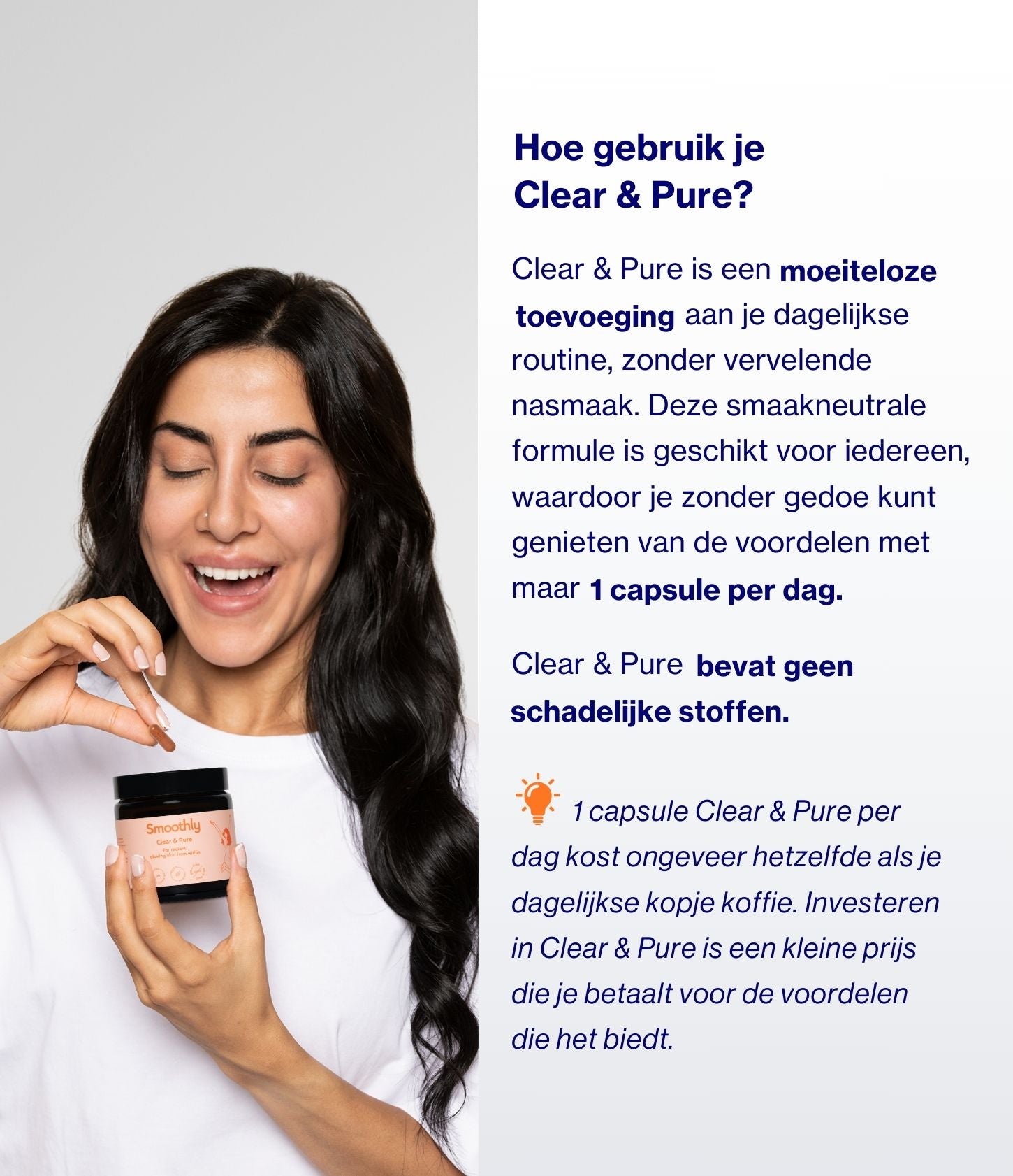 Neem 1 capsule per dag in met je favoriete drankje. Clear & Pure is smaakneutraal en moeiteloos te integreren in je dagelijkse routine.