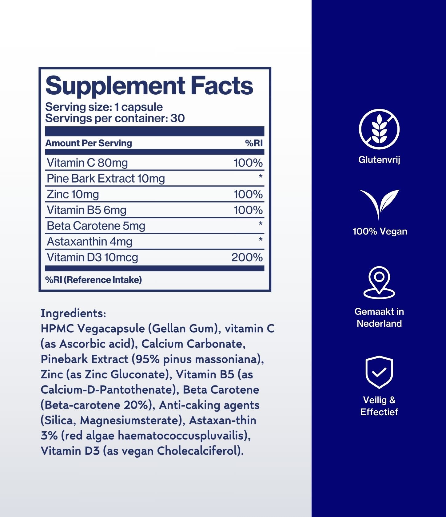 Ingrediënten: HPMC vega-capsule, vitamine C (als ascorbinezuur), vulmiddel (calciumcarbonaat), pijnboomextract (95% proanthocyanidinen), zink (als zinkgluconaat), vitamine B5 (als calcium-d-pantothenaat), bètacaroteen (bètacaroteen 20%), antiklontermiddel (silica), antiklontermiddel (magnesiumstearaat), astaxanthine (rode algen Haematococcus pluvialis), vitamine D3 (als cholecalciferol).