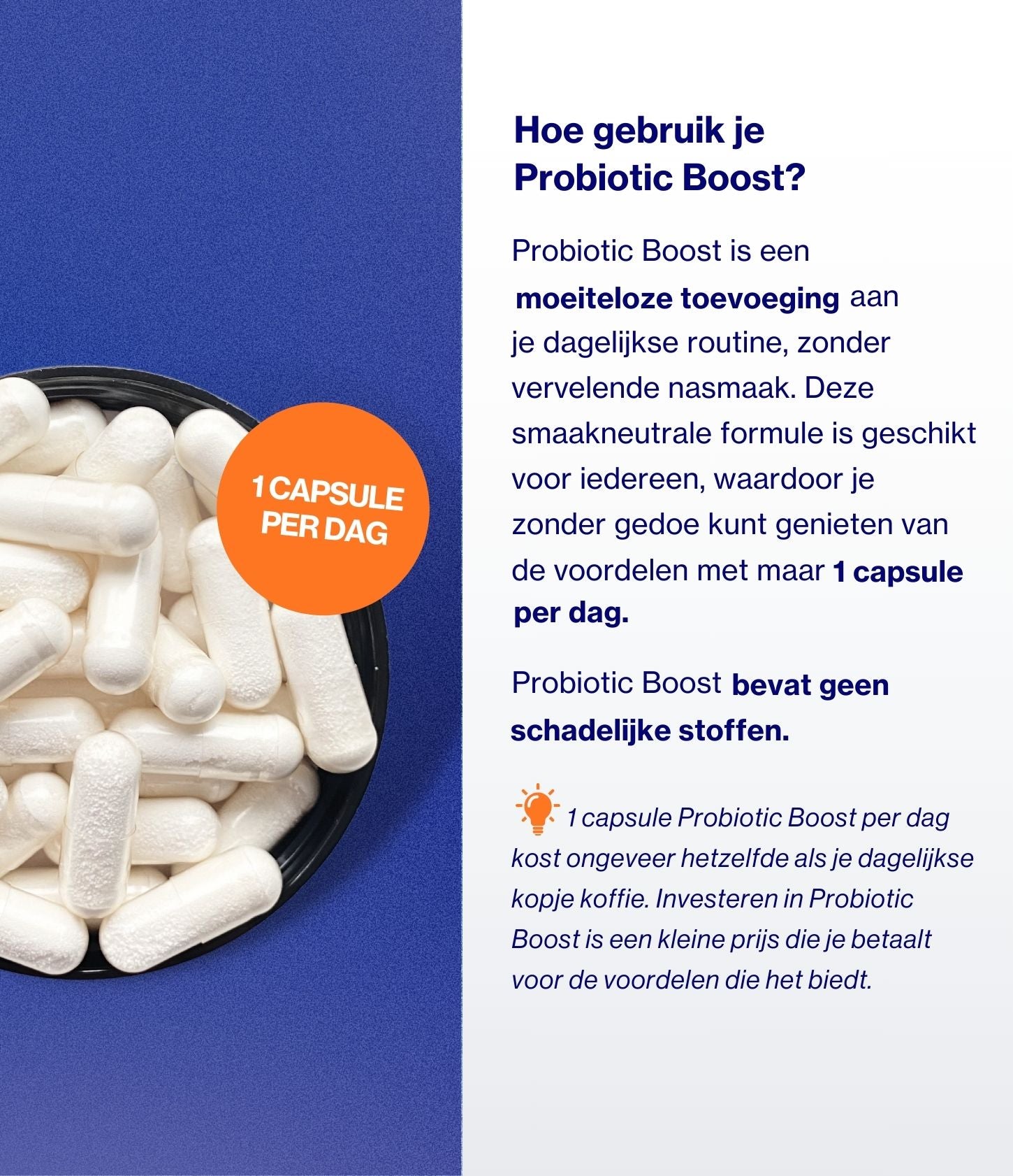 Voor optimaal effect raden we het aan om Probiotic Boost op een lege maag in te nemen, 30 minuten voor je ontbijt.