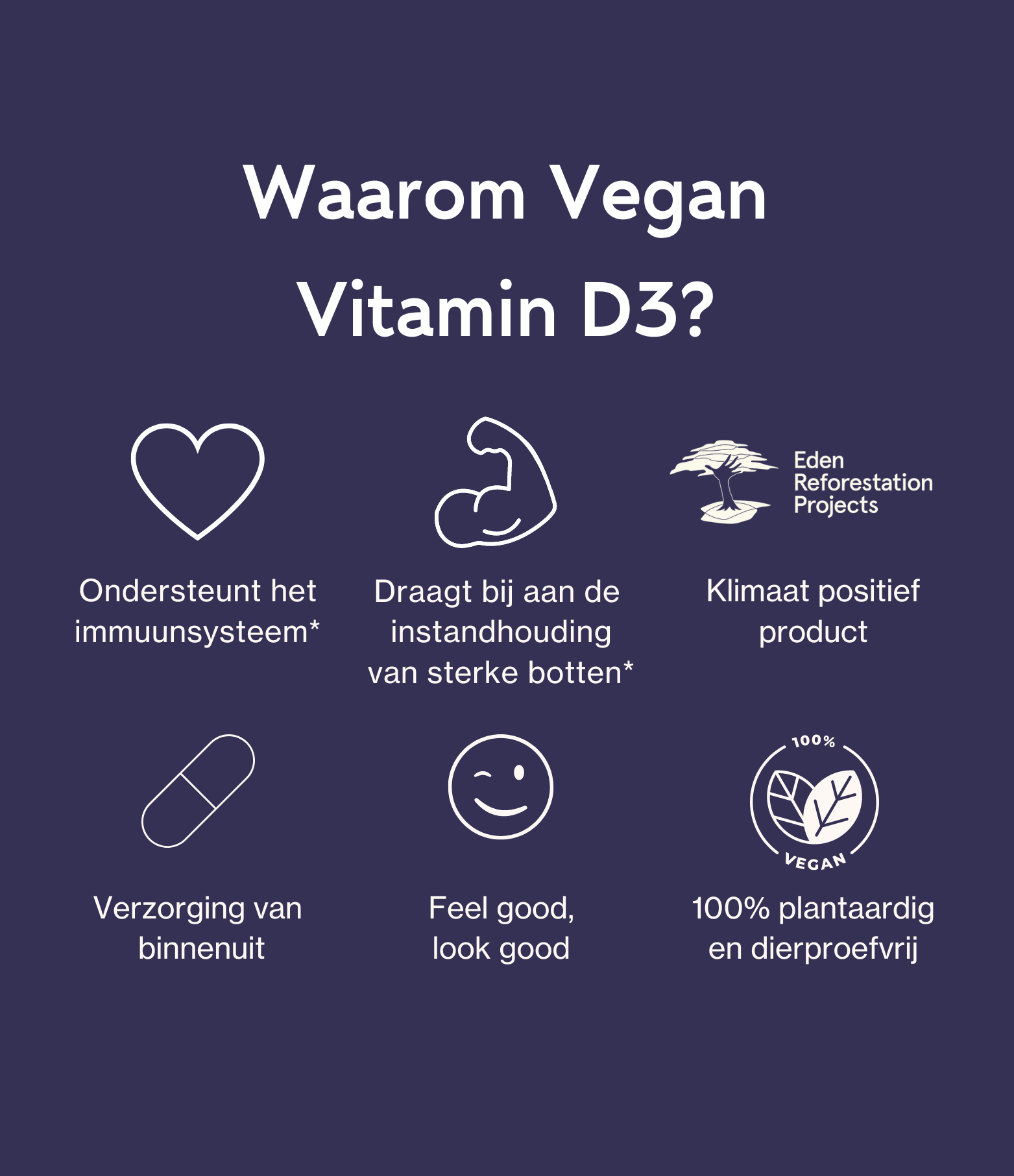 • Vegan Vitamin D3 is niet alleen het diervriendelijkste alternatief, ook is het duurzamer. Zo zijn we klimaatpositief, kiezen we de meest duurzame verpakkingen, werken we 100% vegan en cruelty-free en verzenden we supplementen in recyclebaar karton met DHL Go Green. Daarnaast ondersteunt Vegan Vitamin D3 je gezondheid op verschillende manieren, zo zorgt het mede voor een goede weerstand, een sterk gebit en ondersteunt het je spieren.*